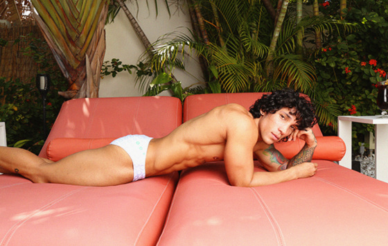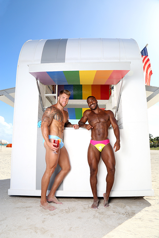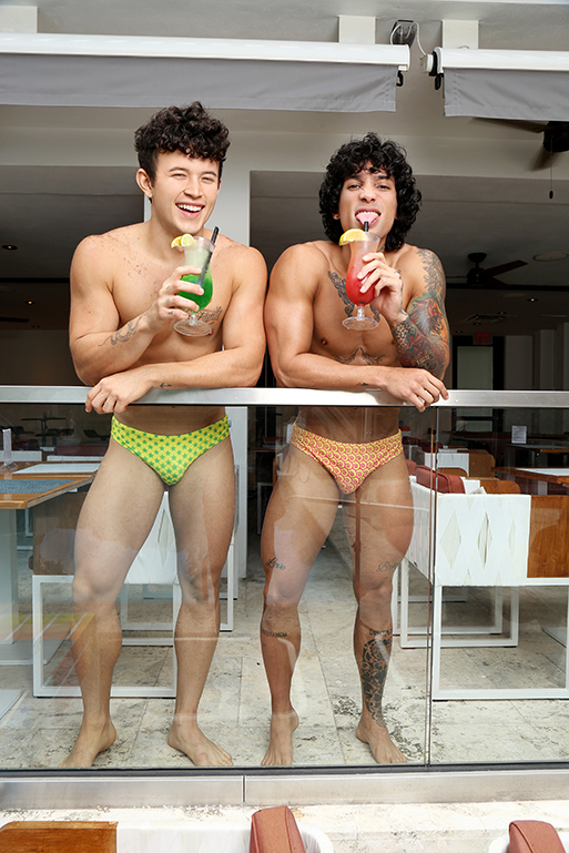 Two guys are putting glitter on each other before heading to the party in Mykonos.