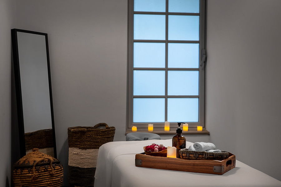 In the Mykonos spa, a couple is sharing a secret (and a glass of champagne).