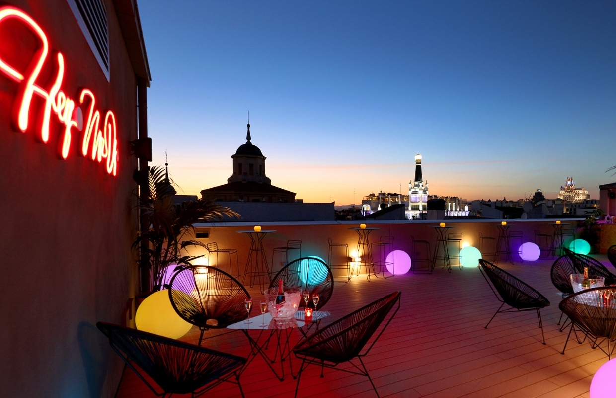 Going up to the terrace of the Axel Hotel Madrid is going up to heaven. In the morning, tranquillity on the roofs of the capital. As the day progresses, it becomes a point to meet and to be seen.