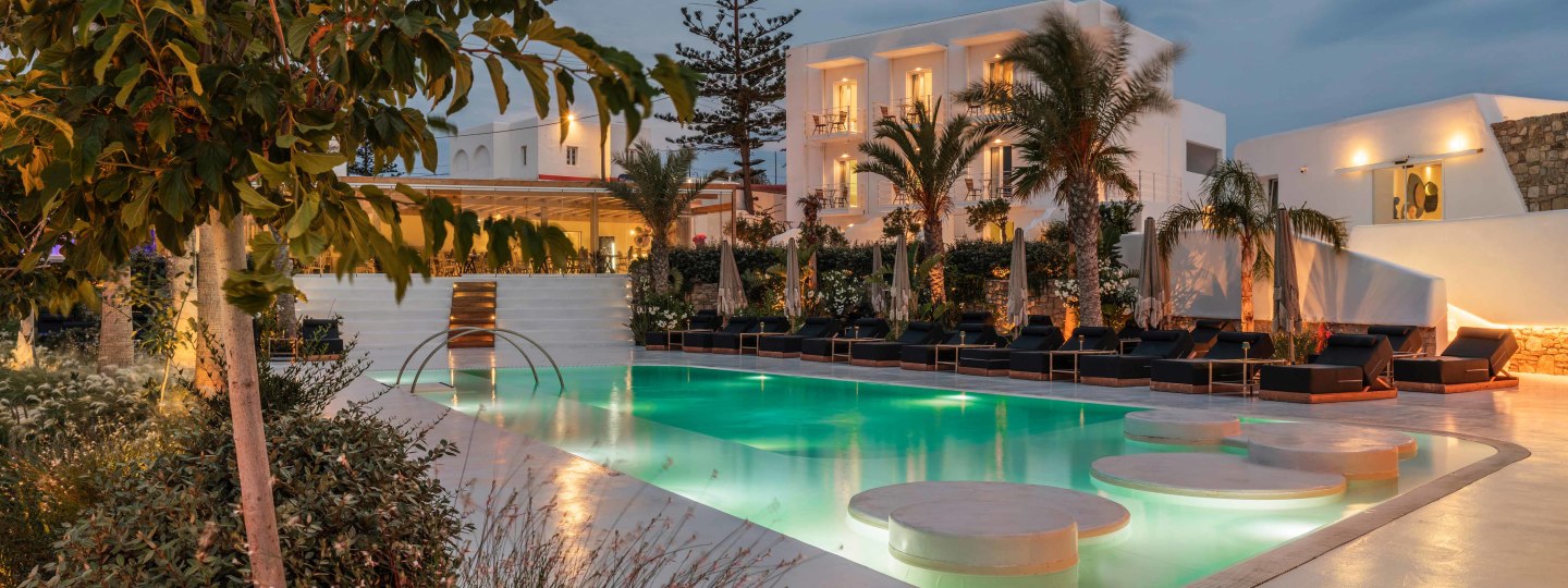 Imagínate que estás en un santuario con una piscina como escenario principal y suites con piscinas privadas, todo dentro del paraíso blanco y azul de Mykonos.