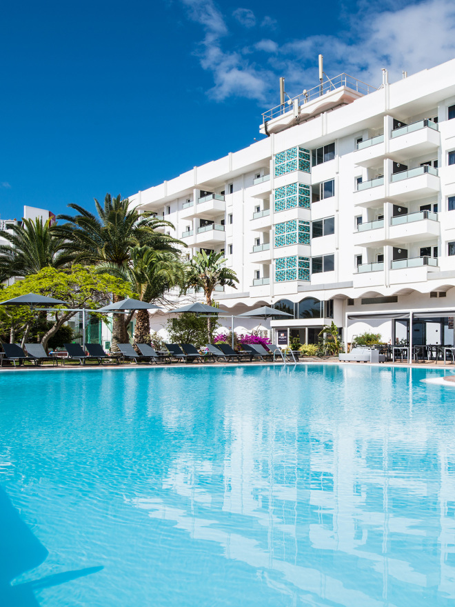 Un jardín con palmeras y las mejores pool parties de Playa del Inglés, a unos pasos del único centro comercial LGBTQIA+ del mundo.